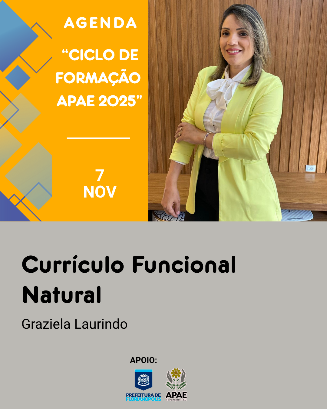 Novembro chegou e nesta semana daremos continuidade a agenda do "Ciclo de Formação APAE 2025". Graziela Laurindo será a palestrante sobre Currículo Funcional Natural.