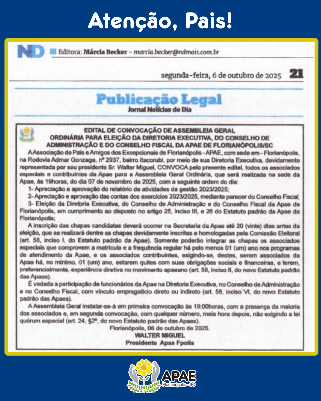 Informamos que na próxima sexta-feira (7), às 19h00, acontecerá na APAE Florianópolis a Assembleia Geral Ordinária para a Eleição da Diretoria Executiva, do Conselho de Administração e do Conselho Fiscal da APAE de Florianópolis/SC, triênio 2026/2028.
